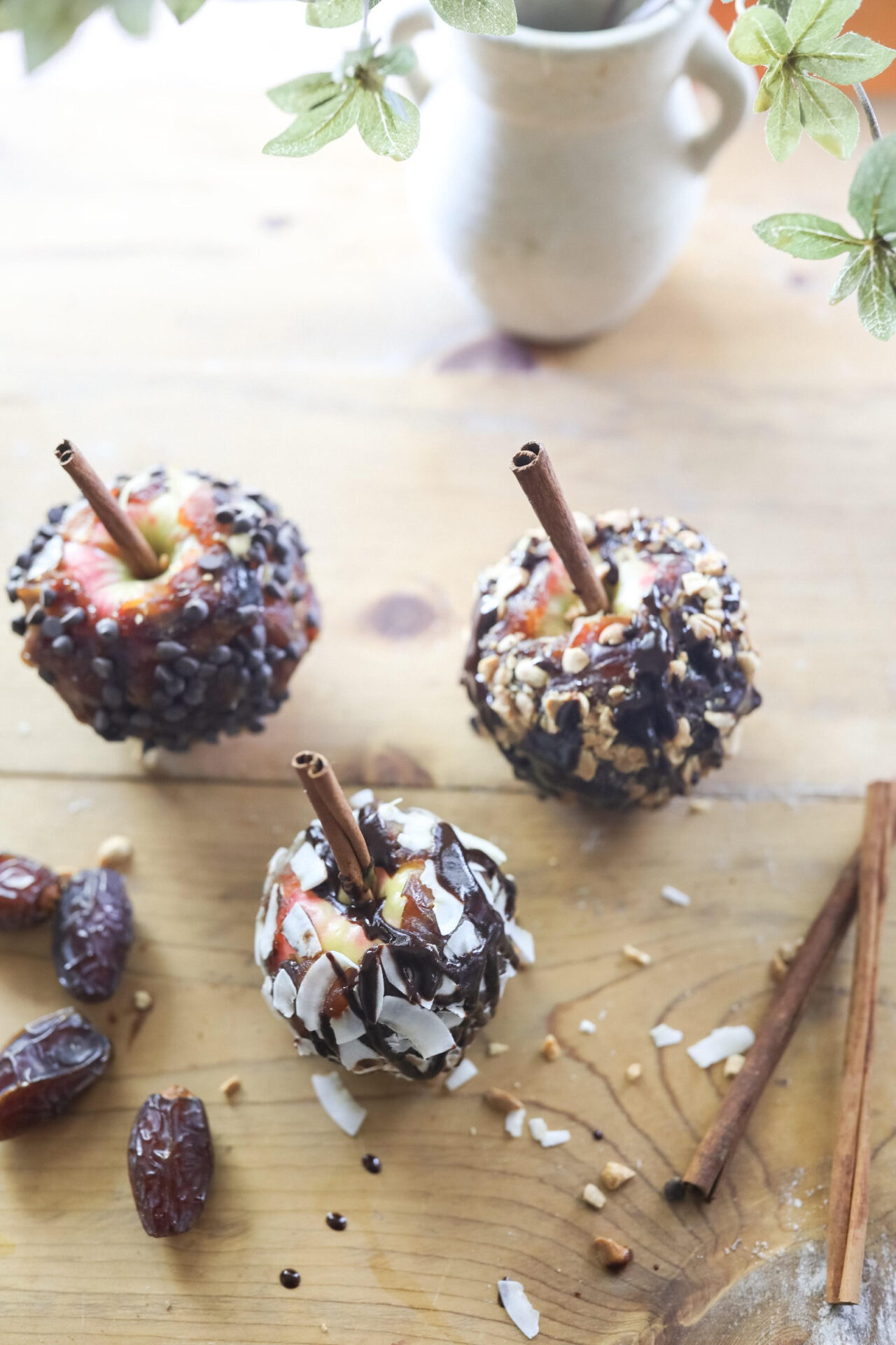 4. Once you fully cover all the apples, take a handful of your topping(s) of choice and press it into the dates until the apple is covered. Repeat with each apple.