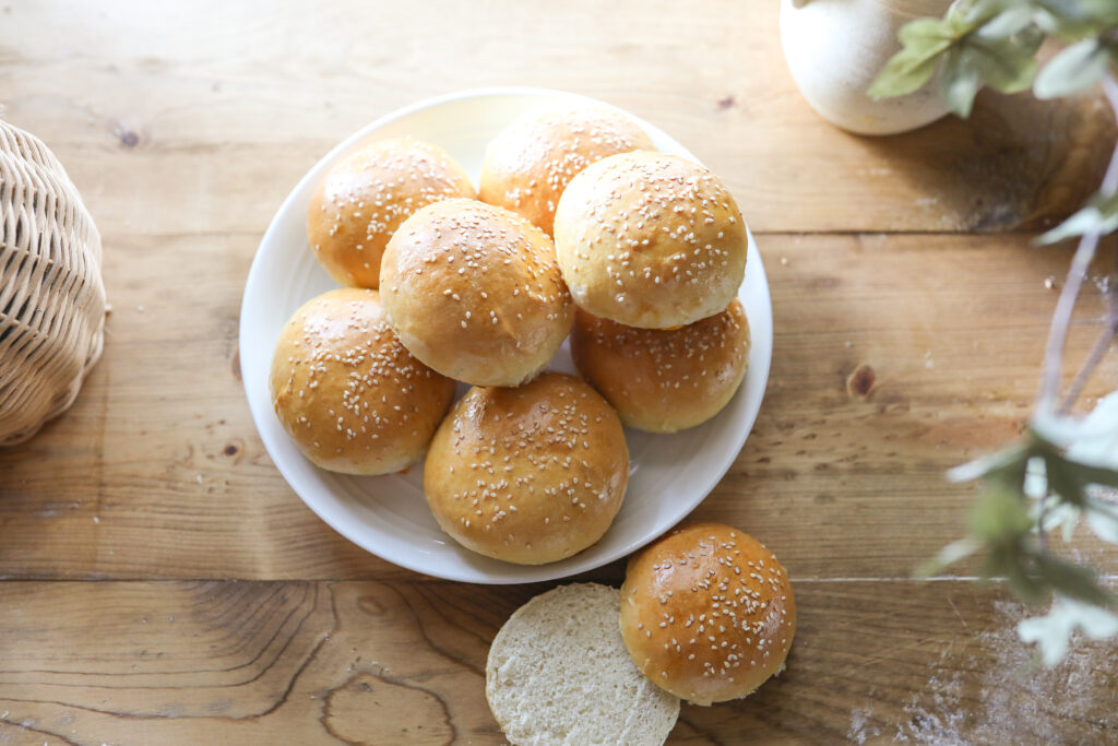 You don’t need any fancy equipment. Though you can use a stand mixer to knead the dough for this recipe— it’s not required. You can make perfectly delicious hamburger buns at home by kneading the dough the old fashioned way— with your hands!