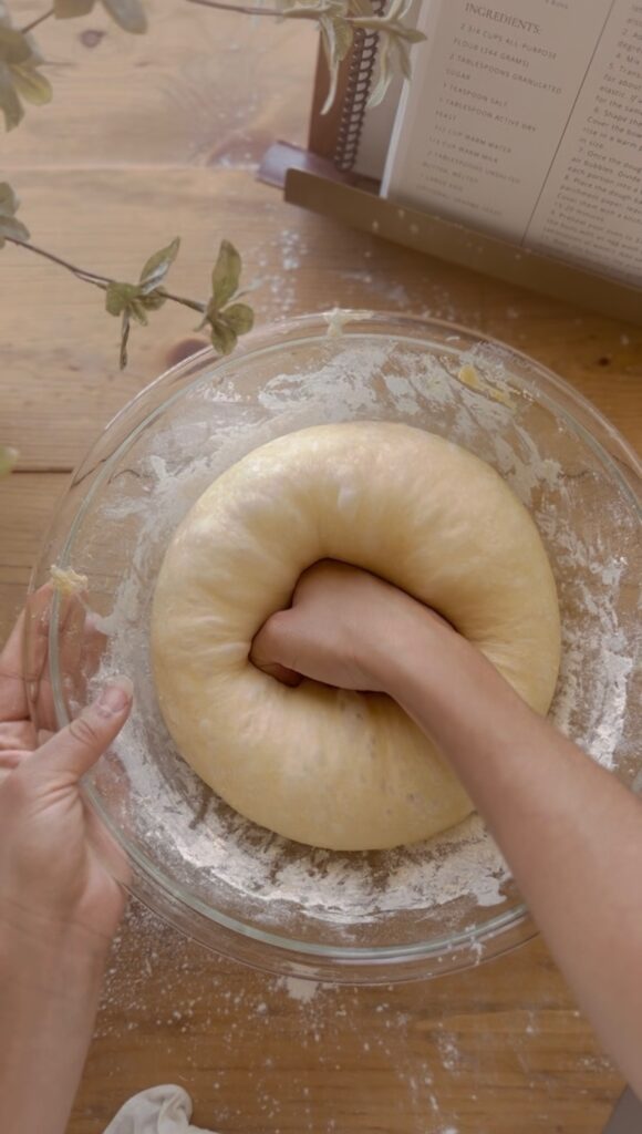 5. Once the dough has risen, punch it down to release any air bubbles. Divide the dough into 8 equal portions and shape each portion into a ball.