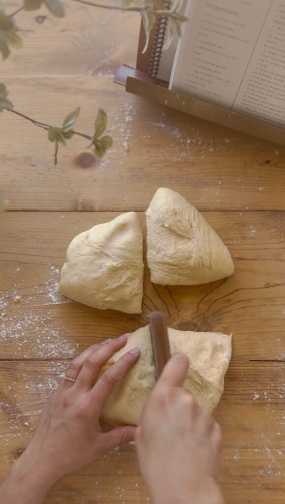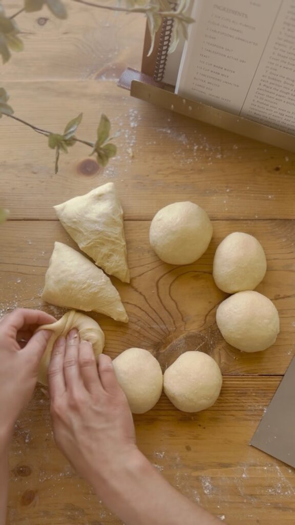 - Once the dough has risen, punch it down to release any air bubbles. Divide the dough into 8 equal portions and shape each portion into a ball.