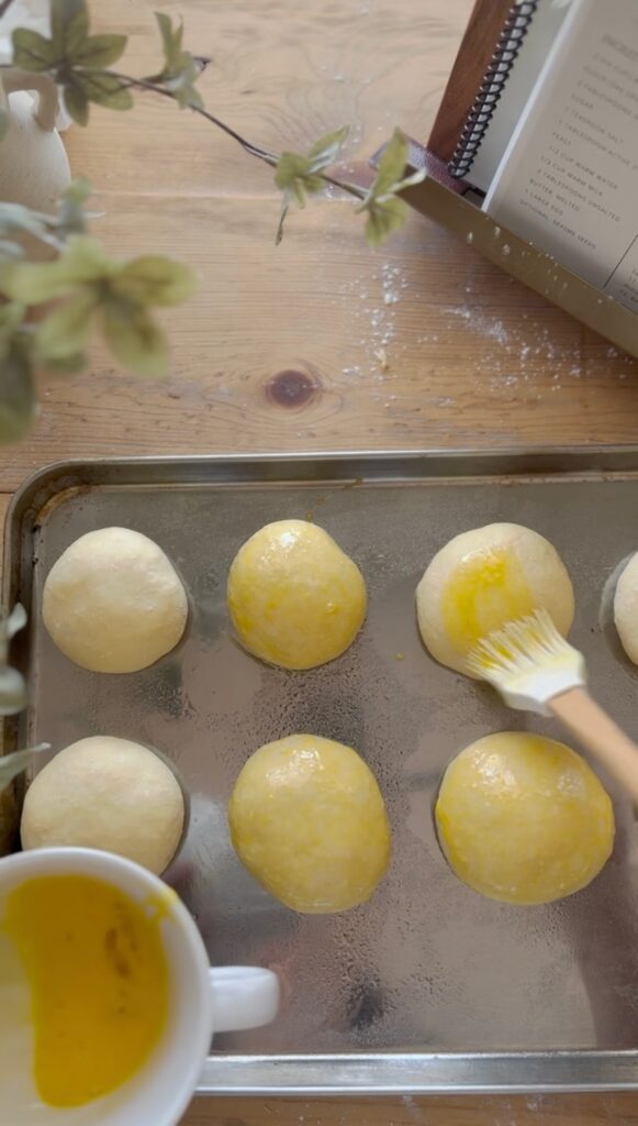 - Place the dough balls onto a parchment-lined baking sheet. Leaving a little space between each bun. Cover them with a kitchen towel and let them rise for another 15-20 minutes.