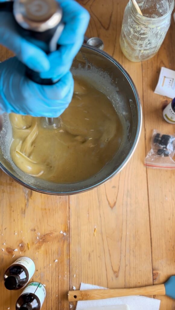 5. Combine & Blend: Prepare your workspace, protecting your counter with thick cardboard or another protective layer. Slowly pour the lye solution into the melted fats and oils. Use an immersion blender to mix until it reaches a thin trace (a light pudding-like consistency).If using fragrance or essential oils, stir them in at this stage.