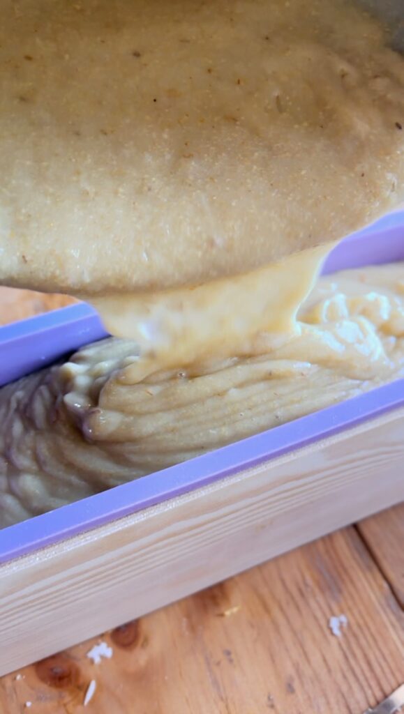 6. Molding & Curing: Immediately pour the soap batter into a 42 oz mold. Place the mold in the refrigerator or freezer overnight to set. The following day, remove the soap from the mold and cut it into bars. Let the bars cure for 4-6 weeks before use.