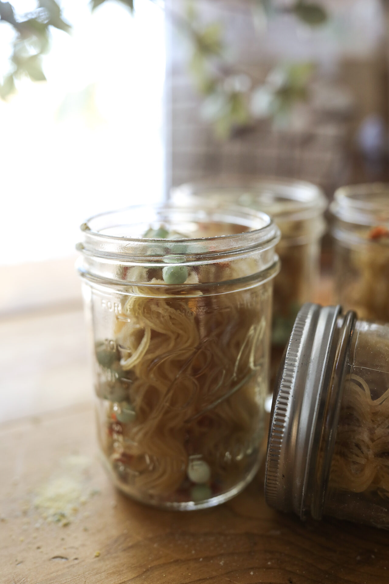 - Gather your mason jars. Add 2 tbsp of seasoning mix into each jar, along with 1 block of dried rice ramen noodles, and ¼ cup mixed veggies.